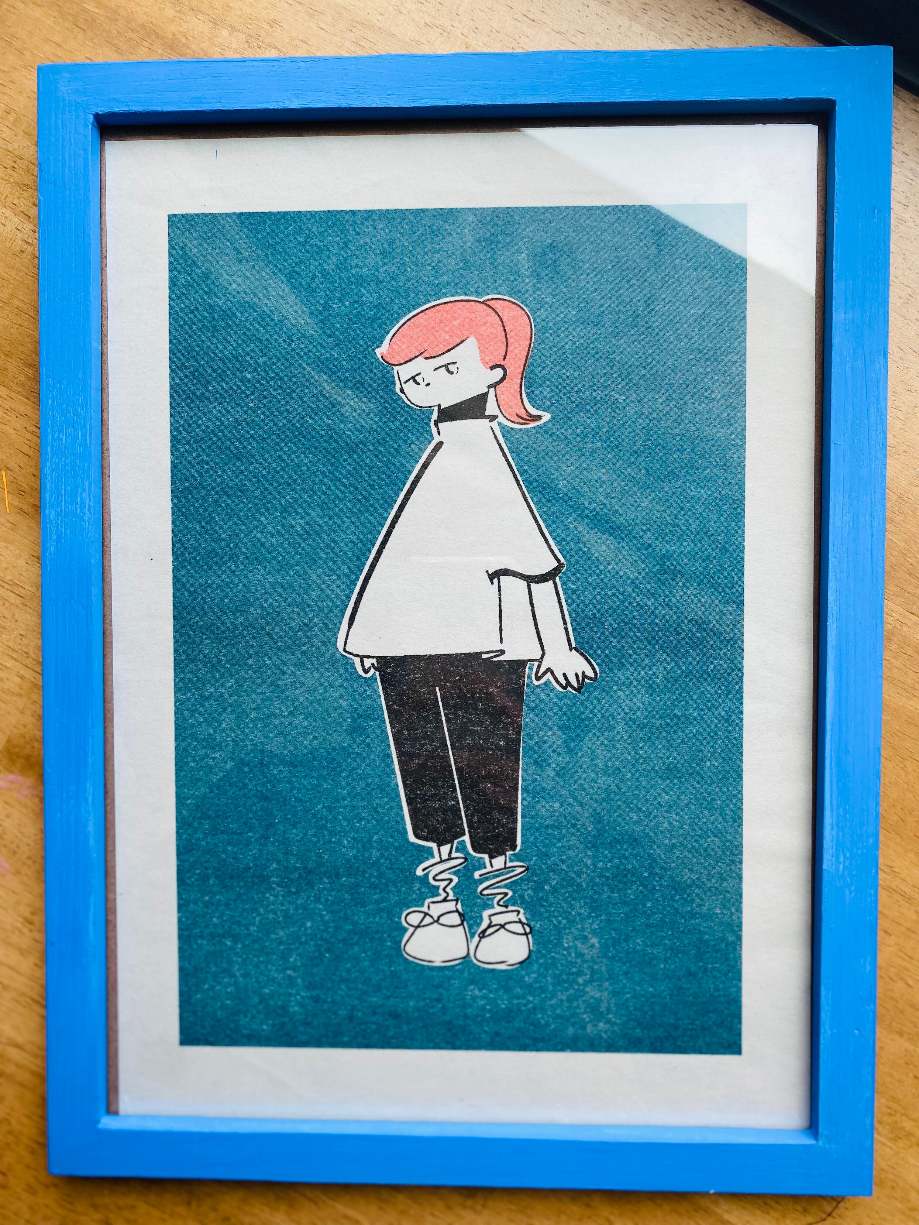 ブルーの額装が付いてます。このままお部屋に飾って頂けます。こちらも手作業で塗った物になります。温かみを楽しんで下さい。